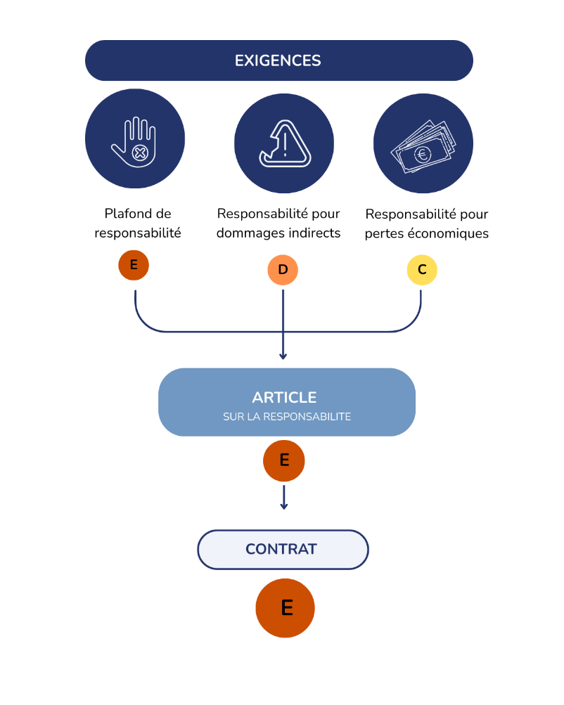- Par exigence : chaque exigence contractuelle (par exemple responsabilité, confidentialité, durée, etc.) est évaluée individuellement et reçoit une note de A à E, uniquement si elle est pertinente pour le contrat analysé. Cette notation permet de repérer rapidement les clauses qui présentent un risque spécifique.
